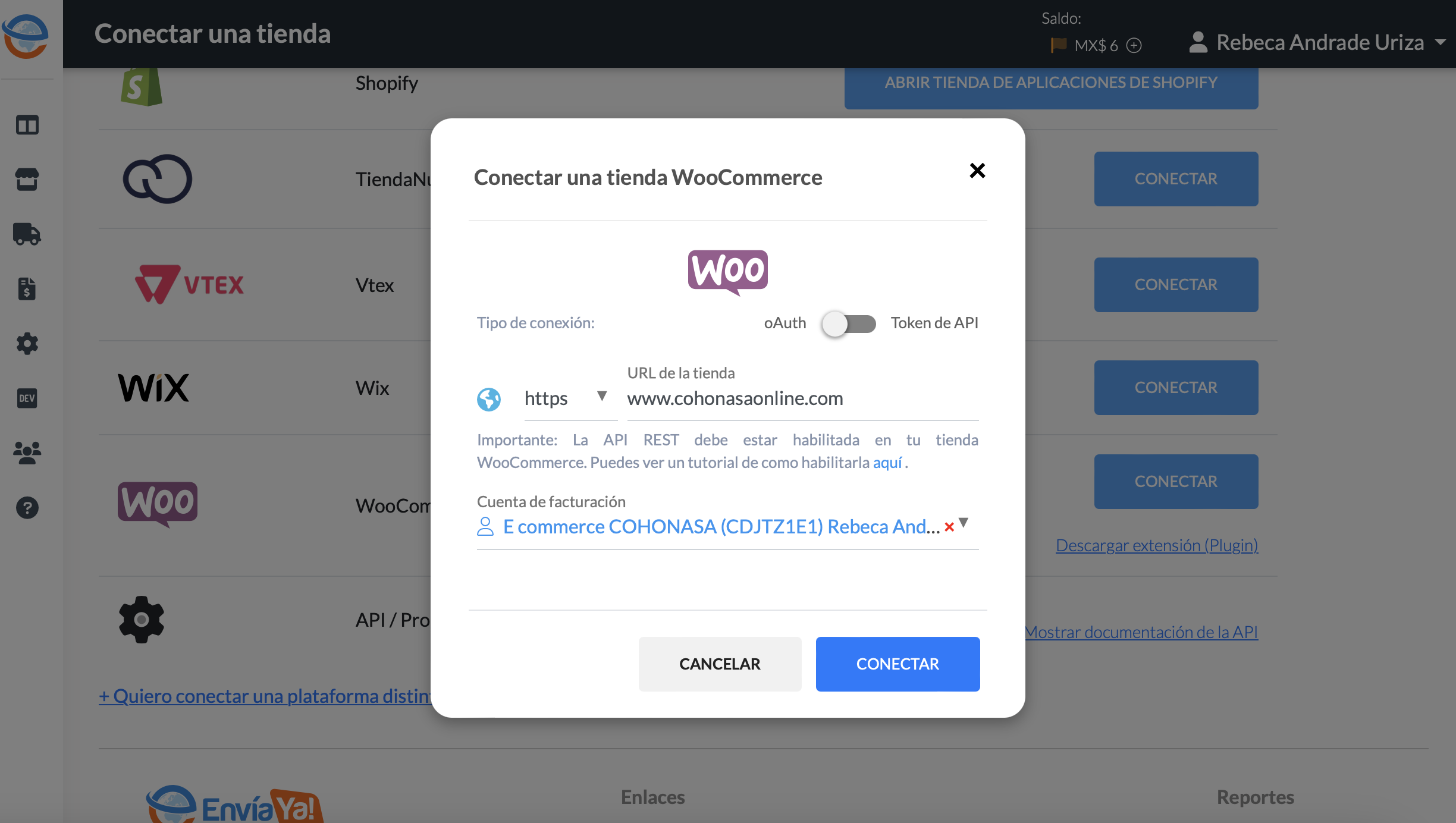 www.cohonasaonline.com, (el cual si me permite poner) lógicamente en ese dominio principal no está WooCommerce instalado, no hay API KEYS para generar y no hay nada que pueda enlazar con Envia Ya! para que hagan la conexión.