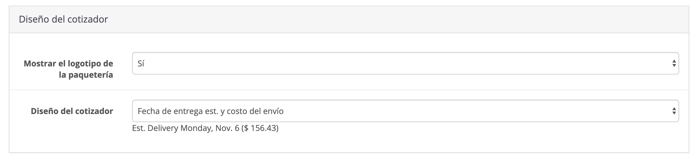 Con estas opciones puedes configurar el aspecto del cotizador de tu carrito. Selecciona en "Mostrar el logotipo de la paquetería" si quieres que aparezcan junto al servicio el logotipo de la mensajería.