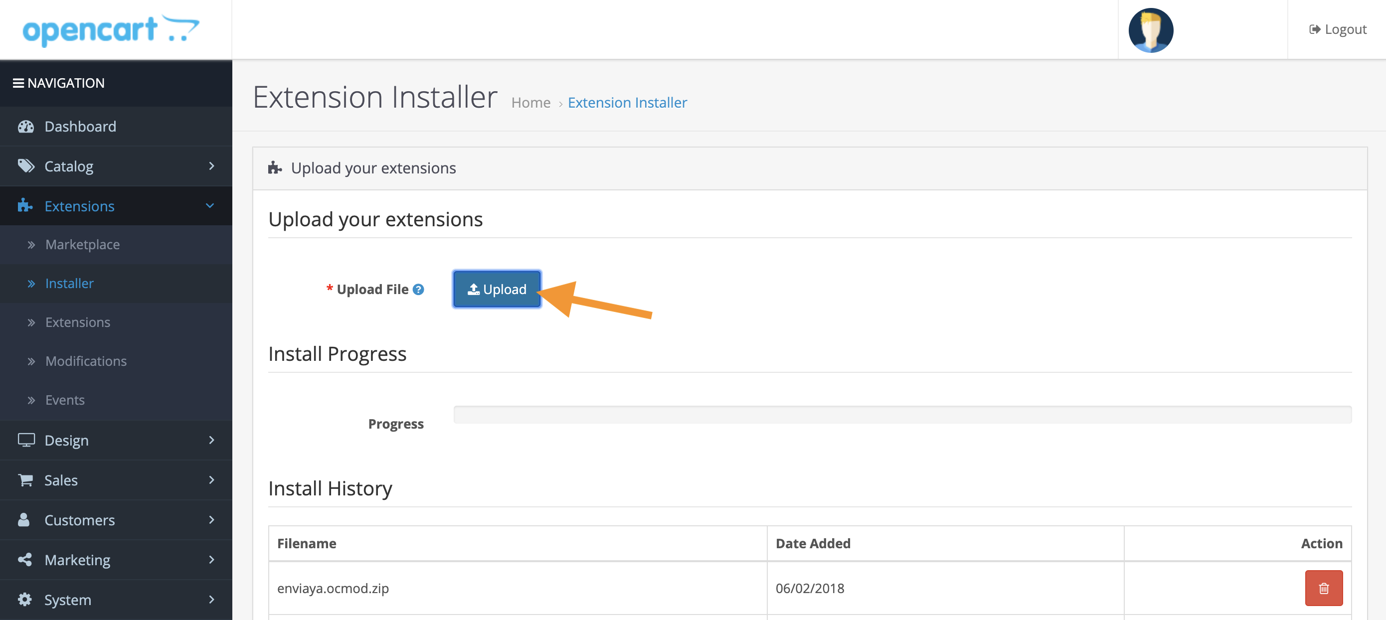 En el menú principal lateral, haz clic en el item de menú Extensions > Installer. Verás un botón de "Upload", una barra de proceso de instalación y el historial de extensiones instaladas. En la parte superior de la pantalla clica el botón "Upload".