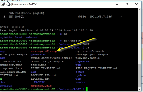finalizar la instalación de MAGENTO2. Escribiremos el nombre de nuestro archivo .ZIP, unzip enviaya.zip.